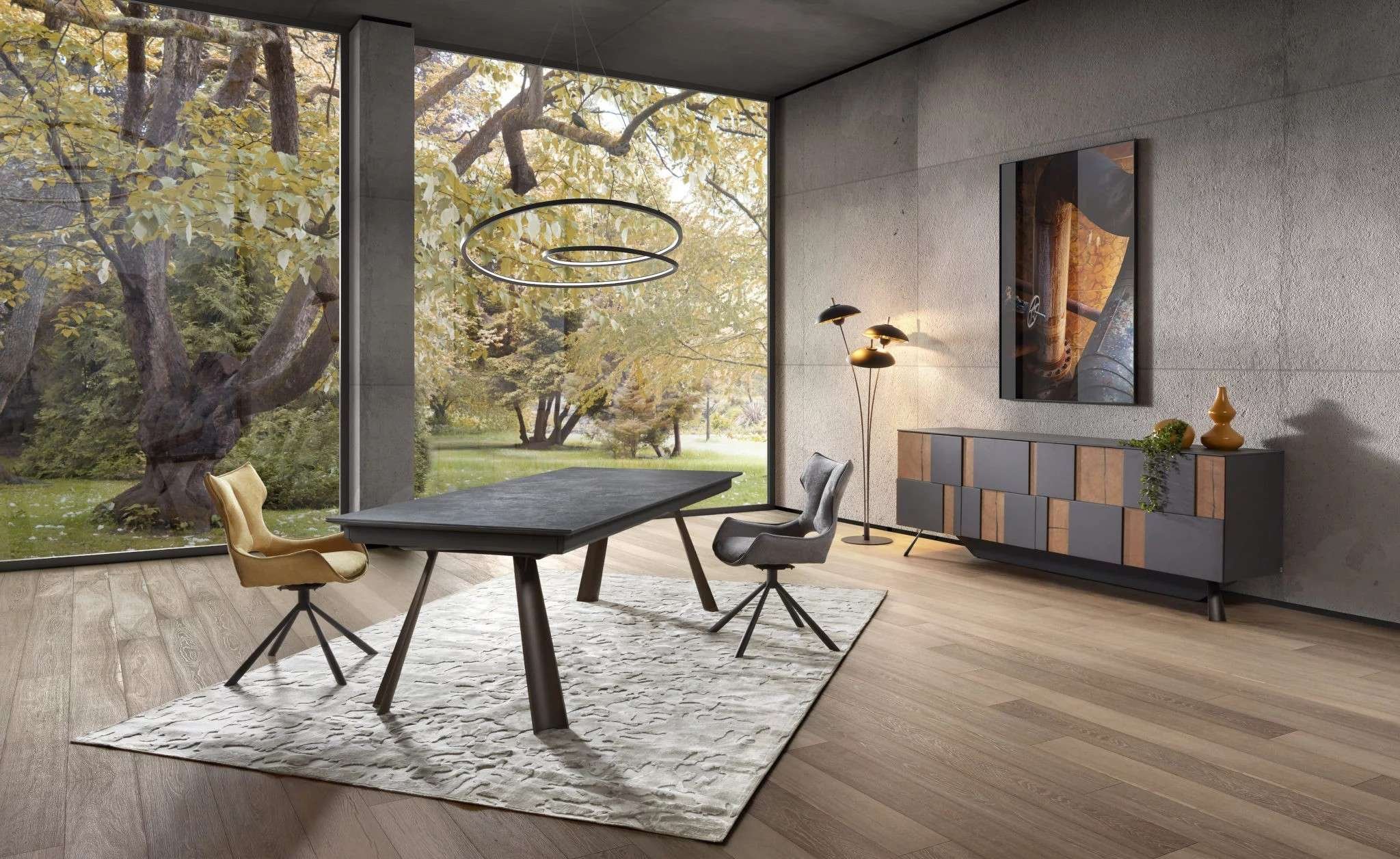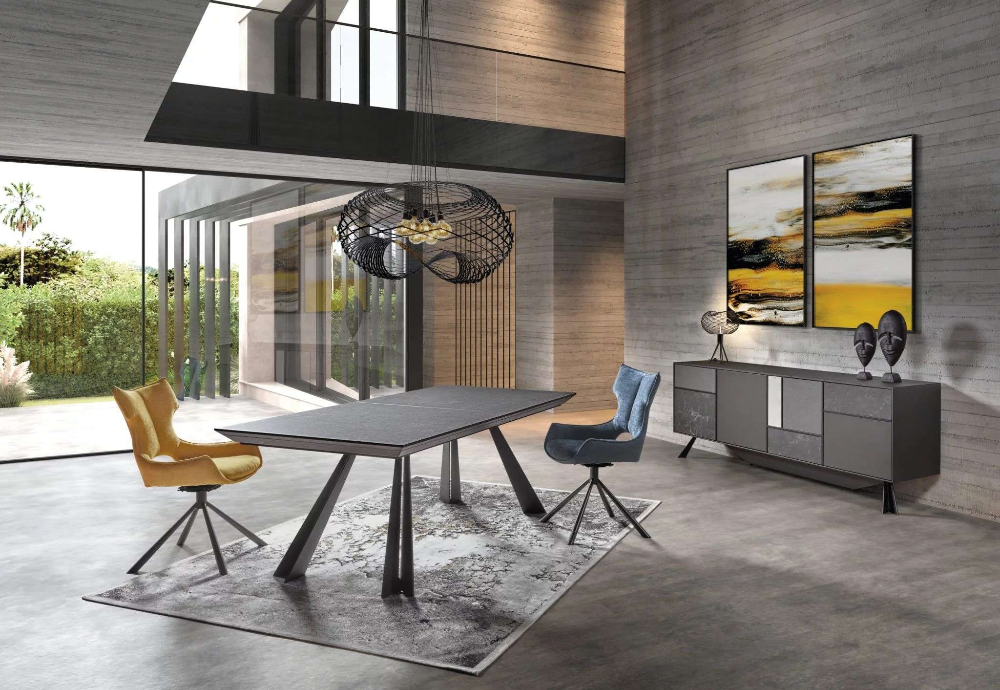 La table STELAA et ses larges bords, contribuent à l’impression de force et dissimulent une rallonge ; les pieds de fer légèrement évasés rassurent en ancrant dans le sol cette table grand format. Au final, une puissance qui donne à l’ensemble STELAA une touche d’atelier de fonderie. On retrouve dans cette table, le même revêtement de surface en céramique qui offre un toucher finement nervuré, et une résistance inégalée.